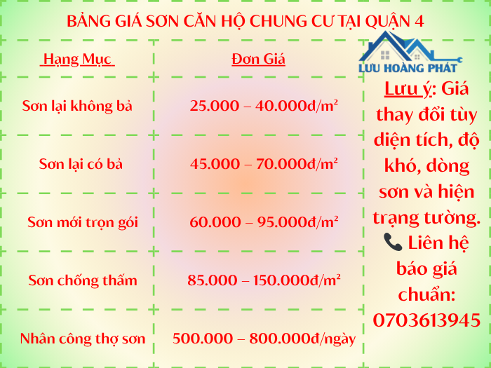 Giá tốt, thi công sạch đẹp, đúng tiến độ. Nhận sơn mới, sơn lại căn hộ cũ, xử lý bong tróc, ẩm mốc. Gọi ngay 0703.613.945 để được tư vấn và báo giá nhanh, khảo sát tận nơi và nhận phương án phù hợp nhất cho căn hộ của mình.